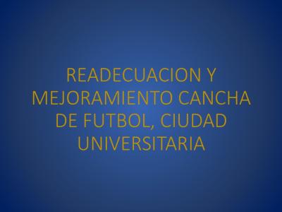 El proyecto “Readecuación y Mejoramiento Cancha De Fútbol, Ciudad Universitaria” tiene como objetivo principal el cambio integral de la superficie de cancha y todas las obras complementarias requeridas. El proyecto se desarrolla en respuesta a la solicitud planteada por las autoridades de la Facultad de Humanidades y Artes, Departamento de Cultura Física y Deportes UNAH-CU para contar con espacios recreativos de apoyo para los juegos JUDUCA 2025 y FICCUA 2026 y con poseer y garantizar espacios recreativos, educativos que fomenten el proceso enseñanza y aprendizaje con altos estándares de calidad y cuente con las certificaciones nacionales e internacionales requeridas.