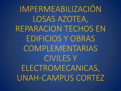 Impermeabilización de losas de azotea y la sustitución y/o reparación de techos de edificios de uso académico, administrativo y de servicio de la UNAH-VS. El área de intervención es de 13,453.59 m², para las actividades de impermeabilización de losas de azotea, sustitución y reparación de techos. Obras complementarias civiles y electromecánicas asociadas varían según las necesidades de cada edificio.